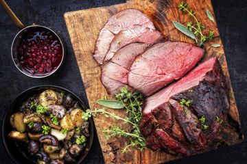 Rôti de cerf cuit à l’ail et thym, accompagné de pommes grenailles rissolées.