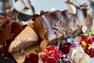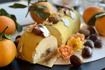 Pour 6 à 8 personnes. Biscuit moelleux amande et marron, confit d’agrumes, crémeux agrumes et aneth, mousse marron, marrons glacés.