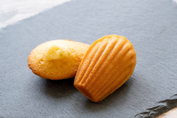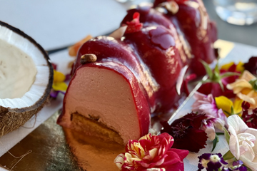 Pour 6 à 8 personnes. Biscuit madeleine, croustillant noisette du piémont, mousse framboise litchi et rose, copeaux de noix de coco.